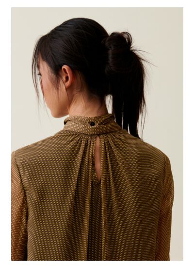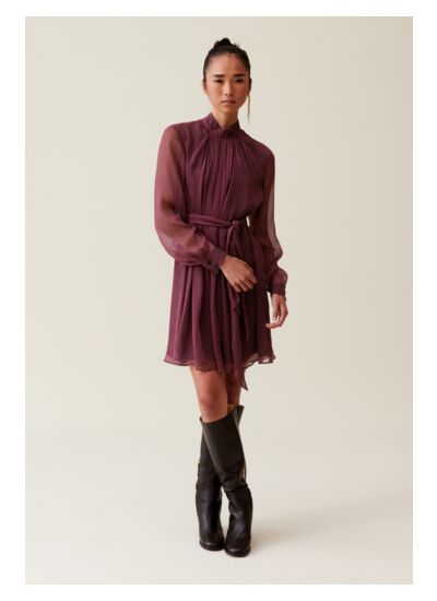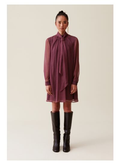 Comment entretenir la robe Claudie Pierlot ? Pour préserver la qualité du tissu et la forme du col lavallière, il est recommandé de suivre les instructions de lavage indiquées sur l’étiquette, généralement un lavage à froid ou un nettoyage à sec.