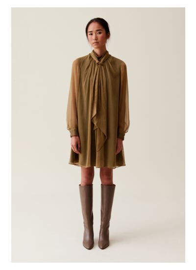 Robe jaune courte et fluide à manches longues avec col lavallière et cravate amovible