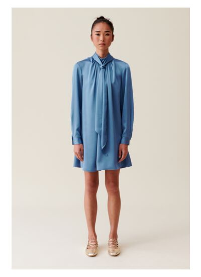 Robe courte et fluide à manches longues avec col lavallière et cravate amovible
