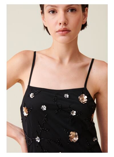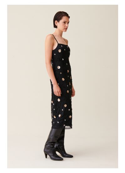 Avec quels accessoires porter cette robe longue pour un look réussi ? Optez pour des accessoires sobres et élégants, comme des escarpins fins et une pochette minimaliste, afin de mettre en valeur les sequins brodés sans surcharger la tenue.