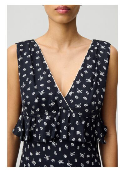 Comment entretenir la robe Claudie Pierlot CFPRO02596 ? Pour préserver la qualité des tissus et la forme des volants, il est recommandé de suivre les instructions de lavage indiquées sur l’étiquette, généralement un nettoyage à la main ou un lavage délicat en machine.