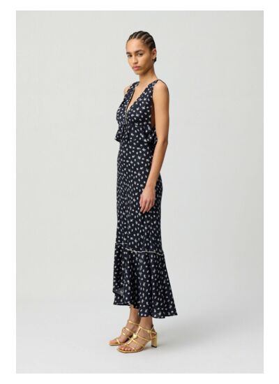 Comment porter cette robe longue volantée ? Elle se prête aussi bien à une tenue de journée sophistiquée qu’à une soirée chic. Associez-la à des escarpins pour un look élégant ou à des sandales pour une allure décontractée mais raffinée.