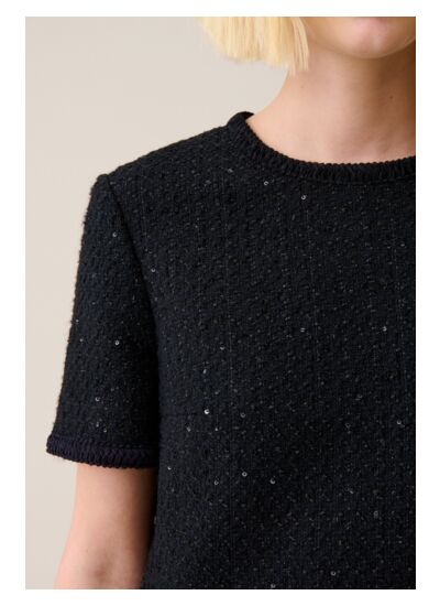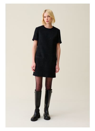 Cette robe noire courte en tweed Claudie Pierlot convient-elle pour une tenue de soirée élégante ? Oui, son tissu tweed et sa coupe courte offrent un équilibre parfait entre sophistication et modernité, idéal pour une soirée chic ou un événement habillé.