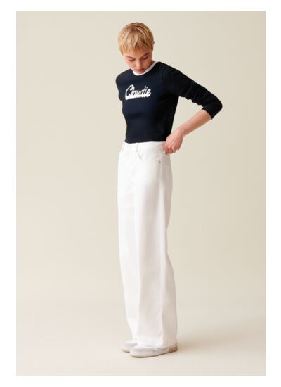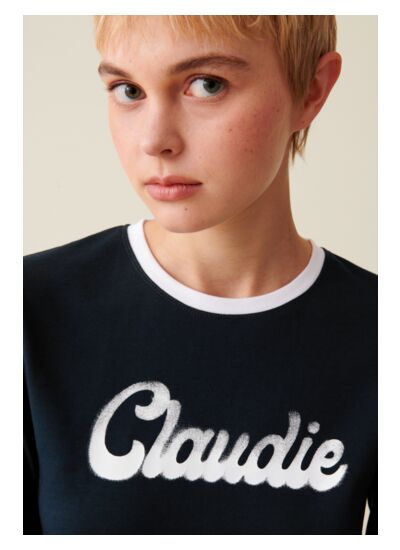 T-shirt à manches longues en coton à col rond avec sérigraphie Claudie et finitions liserais contrastés