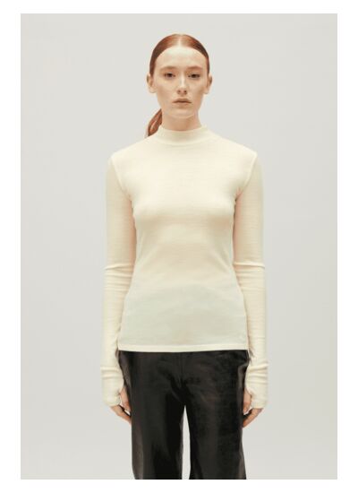 Comment entretenir ce top col montant en laine ? Il est recommandé de laver ce tee-shirt à la main ou en cycle laine à basse température pour préserver la qualité de la fibre. Évitez le sèche-linge afin de maintenir sa forme et sa douceur.
