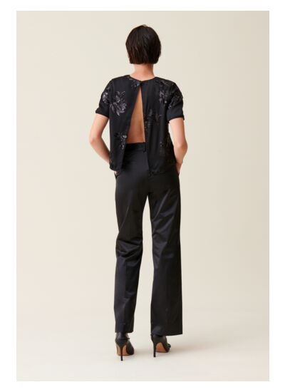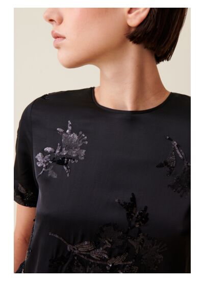 Top noir à col rond avec manches courtes et sequins à motifs floraux
