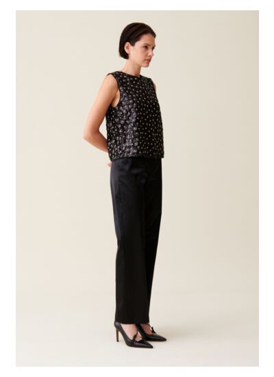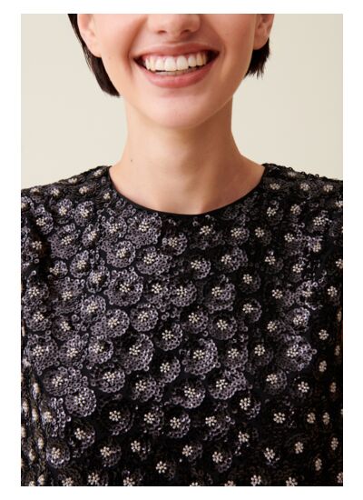 Ce top noir à sequins brodés est-il adapté pour une soirée habillée ? Oui, son design élégant avec sequins et dos ouvert en fait un choix parfait pour une soirée chic ou un événement spécial, apportant une touche sophistiquée et moderne à votre tenue. Comment entretenir ce top pour préserver les sequins et la qualité du tissu ? Il est recommandé de le laver à la main à l'eau froide ou de le confier à un nettoyage professionnel pour éviter d'endommager les broderies et conserver l'éclat des sequins. Quelle taille choisir pour un ajustement optimal ? Ce top Claudie Pierlot taille normalement, nous conseillons de prendre votre taille habituelle pour un maintien confortable et une silhouette flatteuse. Avec quels vêtements associer ce top pour un look complet ? Il se marie parfaitement avec un pantalon taille haute, une jupe crayon ou un jean slim, complété par des escarpins ou des bottines pour un style à la fois élégant et contemporain. Ce top convient-il à toutes les saisons ? Principalement conçu pour les saisons plus fraîches, il peut être porté en automne et hiver avec une veste légère ou un blazer, ou en soirée estivale grâce à son dos ouvert qui assure une bonne respirabilité.