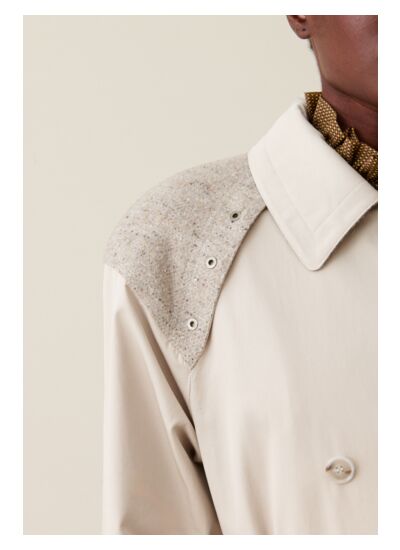 Trench coat beige bi-matière long avec empiècements aux épaules et ceinture amovible