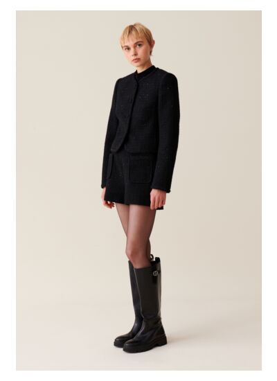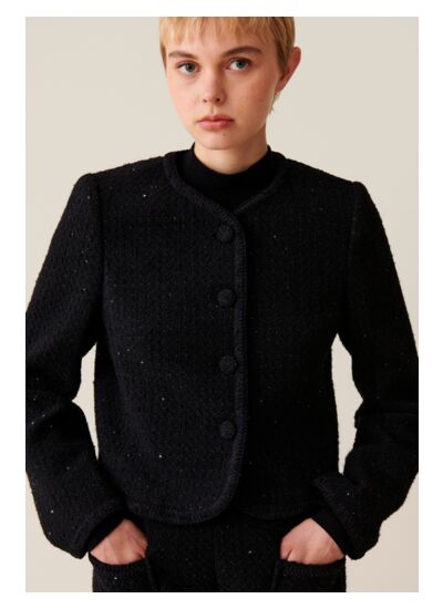 De quel matériau est composée cette veste ? Cette veste est confectionnée en tweed noir, un tissu reconnu pour sa texture raffinée et sa durabilité, apportant une touche sophistiquée à votre tenue.