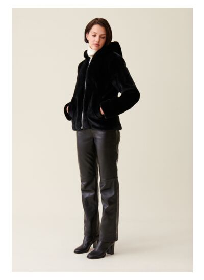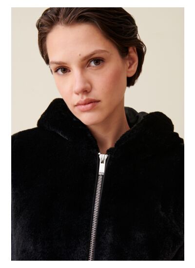 Veste noire à capuche en fausse fourrure, coupe droite et ample avec fermeture zippée