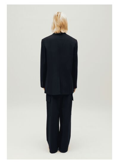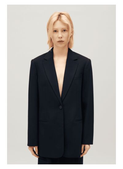 Comment porter cette veste tailleur oversize marine pour un look réussi ?