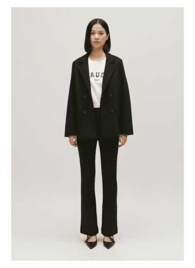 Quelle coupe propose la veste tailleur oversize Claudie Pierlot ? La veste offre une coupe oversize, ample et structurée, qui apporte une silhouette moderne et décontractée tout en conservant l’élégance classique du tailleur.