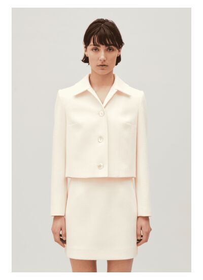 Coupe boite, large col tailleur, manches longues, fermeture boutonnée à boutons nacrés