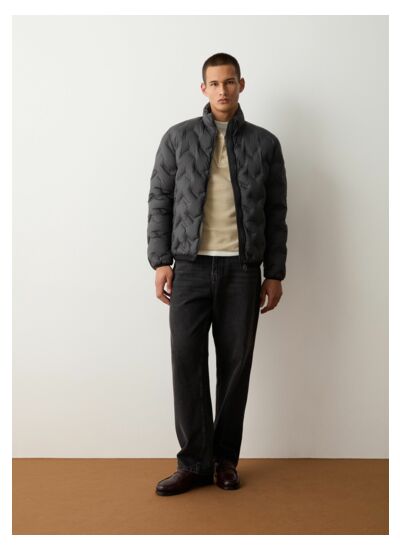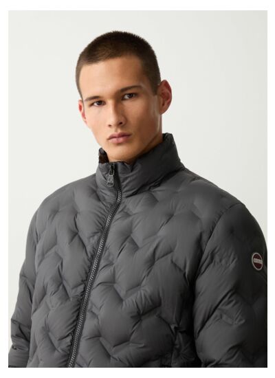 Veste homme réalisé en tissu tubulaire d'aspect mat obtenu par le collage de deux tissus en polyester à l'aide de micro motifs en V. Traitement hydrofuge et imperméabilisant duvet. Le matelassage particulier permet de créer une variation inhabituelle et dynamique du matelassage horizontal classique. L'importante bande élastique à fines côtes en relief qui borde le bas et les poignets donne du caractère à ce vêtement.