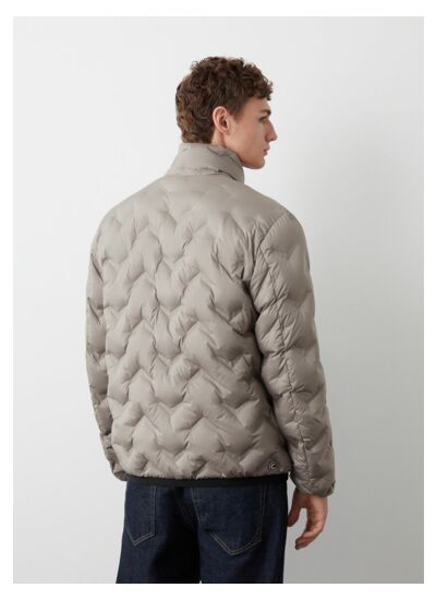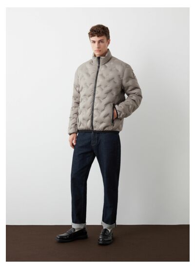 Veste homme réalisé en tissu tubulaire d'aspect mat obtenu par le collage de deux tissus en polyester à l'aide de micro motifs en V. Traitement hydrofuge et imperméabilisant duvet. Le matelassage particulier permet de créer une variation inhabituelle et dynamique du matelassage horizontal classique. L'importante bande élastique à fines côtes en relief qui borde le bas et les poignets donne du caractère à ce vêtement.