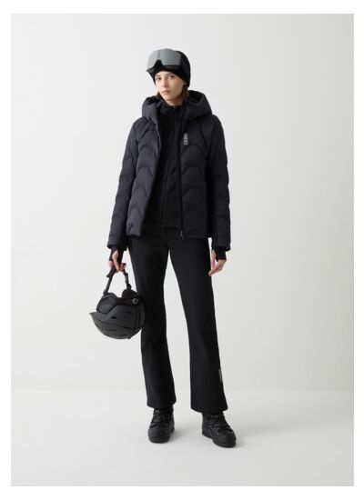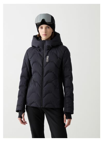 Veste de ski pour femme avec matelassage ondulé caractéristique, en tissu ripstop stretch effet diamant, 100 % recyclé, imperméable résistant à la pression d'une colonne d'eau de 15 000 mm et ayant un niveau de respirabilité de 15 000 g/m2/24h. Des empiècements lisses en softshell stretch valorisent la silhouette et facilitent les mouvements. Le confort optimal est garanti par sa doublure élasticisée et son garnissage en duvet doux. Capuche réglable enveloppante pour une protection supplémentaire contre le froid.