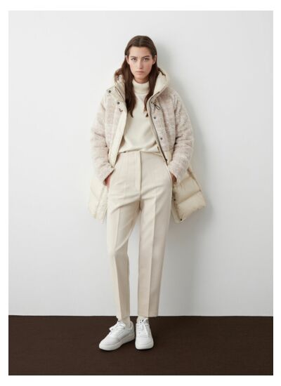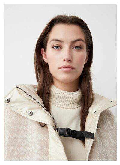 Veste femme avec capuche fixe en fourrure jacquard douce avec motif 3D et tissu imperméabilisant duvet léger avec tissage mini rip-stop et traitement hydrofuge. Garnissage en duvet naturel. Un mélange de matières original caractérise ce modèle confortable et tendance plein de détails pratiques. La bride logotée à l'intérieur munie d'une petite boucle qui fait office de crochet, permet de porter le vêtement sur vos épaules sans craindre qu'il ne tombe. Fonctionnalité et glamour pour ce manteau chaud parfait pour affronter l'hiver.
