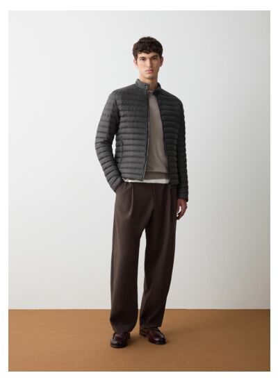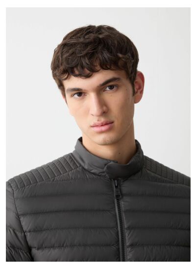 Veste d'automne pour homme, modèle motard, réalisée en tissu mat ultra léger et recyclé. Traitement hydrofuge. Garnissage en duvet naturel. Le matelassage régulier sur le corps se densifie sur les épaules, créant un motif géométrique qui anime ce modèle iconique. Complétez votre look casual ou atténuez la rigueur d'une tenue plus élégante avec cette doudoune 100 grammes pratique et confortable.