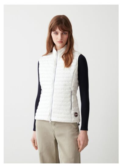 Veste sans manches pour femme en tissu recyclé ultraléger traité hydrofuge. Garnissage léger en duvet naturel. Sa coupe cintrée ajoute une touche de féminité supplémentaire à ce modèle iconique de 100 grammes signé Colmar Originals, proposé dans de nouvelles nuances printanières.