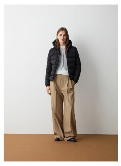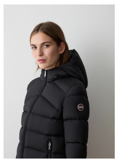 Veste pour femme à capuche fixe, en tissu stretch mat et hydrofuge, garnie de duvet naturel. Les matelassages réguliers sur tout le corps se mêlent aux matelassages en diagonale sur l'empiècement, animant le vêtement. Le cintrage, les zips caractérisés par un fil argenté et le galon élastique de couleur assortie bordant le bas et les poignets, donnent à cette doudoune une note sportive.