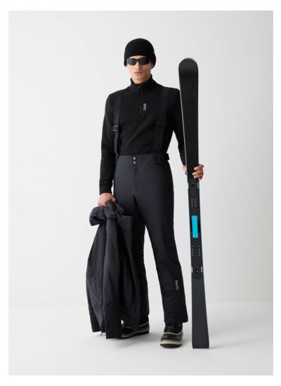 Salopette de ski pour homme réalisée en tissu stretch de polyester 100 % recyclé laminé avec une membrane imperméable résistant à la pression d'une colonne d'eau de 15 000 mm et ayant un niveau de respirabilité de 15 000 g/m²/24h, garnie de ouate stretch Clomax® Flex4way. Partiellement thermosoudée. Un vêtement pratique et confortable avec une doublure douce élasticisée, gage de technicité et de confort.