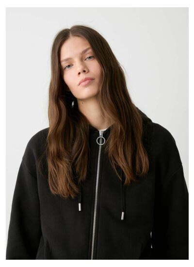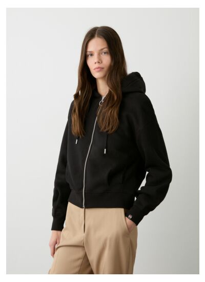 Sweat pour femme zippé sur tout le devant réalisé en tissu de coton mélangé lainé sur l'envers et brossé sur l'extérieur pour apporter un toucher plus doux. Modèle à capuche caractérisé par des pinces dans le bas et sur les poignets qui donnent un peu de volume au vêtement permettant un meilleur ajustement. La petite étiquette avec le logo réalisée avec des fils lurex placée sur le poignet signe ce sweat.