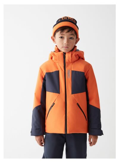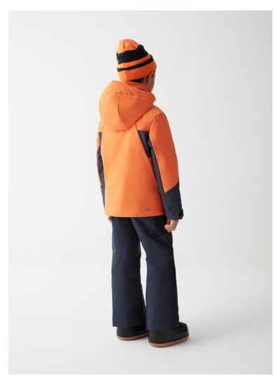 Veste pour garçon à capuche amovible réalisée à partir de deux tissus stretch, l'un d'aspect lisse et l'autre avec armure ripstop, tous deux imperméables (15 000 mm de colonne d'eau), respirants (15 000 gr/m2/24H) et 100 % recyclés. Le rembourrage en ouate Ecosoft avec 85 % de fibres recyclées garantit un bon confort thermique.