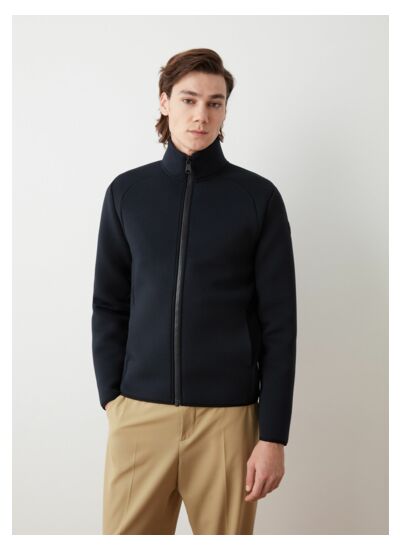 Veste homme non rembourrée avec fermeture zippée sur le devant en maille effet néoprène. Aspect légèrement chiné pour ce modèle minimaliste idéal à porter comme veste en automne ou comme sweat en hiver. Les découpes épurées mettent en valeur la silhouette et cachent les poches latérales. Un galon élastique de couleur contrastée borde les poignets et le bas.