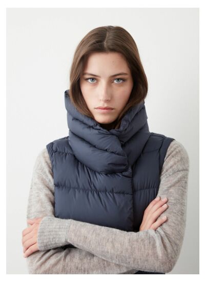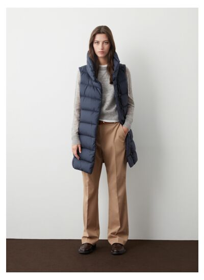 Doudoune sans manches femme mi-longue, réalisée en tissu doux à l'aspect mat traité hydrofuge. Garnissage en duvet naturel. Le col large et enveloppant de ce modèle au matelassage régulier et la ceinture élastiquée qui souligne la taille sont les principales caractéristiques de ce vêtement contemporain et insolite. Facile à porter et confortable, elle se marie parfaitement avec l'un des pulls ou sweats de la collection.