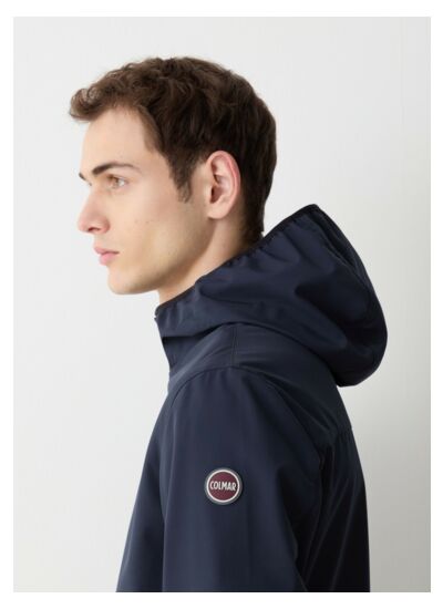 Veste pour homme à capuche, réalisée en softshell stretch imperméable résistant à la pression d'une colonne d'eau de 5 000 mm et respirant à 5 000g/m2/24h. Traitement hydrofuge. Ce tissu très confortable et pratique vous accompagne dans tous vos mouvements. Détail de style : l'inscription par transfert Colmar Originals sur la patte intérieure, de la couleur du zip. Un vêtement polyvalent qui ne doit pas manquer dans votre dressing.