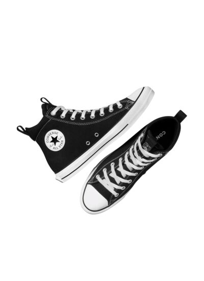 Tige en toile noire, semelle extérieure en caoutchouc blanc, fermeture à lacets, logo Converse sur la cheville. Disponible du 36 au 45. Poids léger pour un port agréable toute la journée.