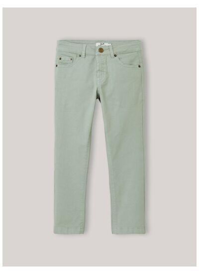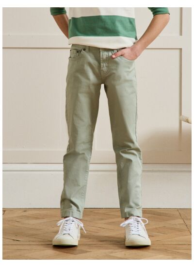 Pantalon 5 poches coloré pour garçon, collection 25E saison. Marque Cyrillus. Coupe ajustée, tissu robuste et facile d’entretien. Cinq poches fonctionnelles, fermeture zippée avec bouton.