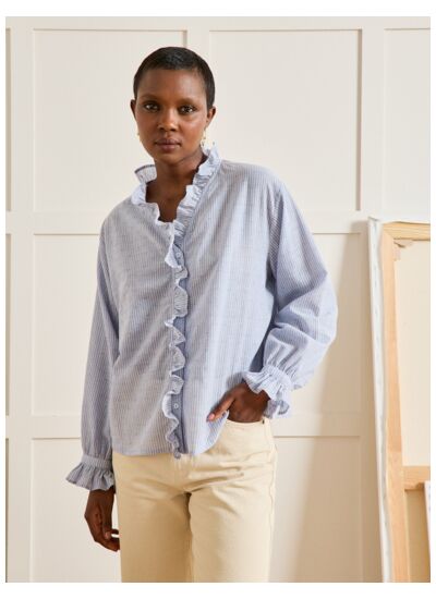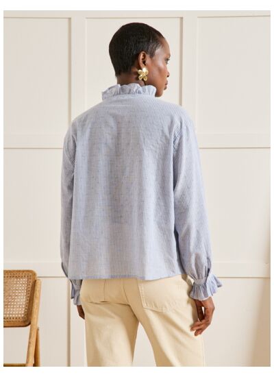 Fabriquée dans un tissu dobby rayé, cette chemise présente une coupe féminine, un col classique et des manches longues avec poignets boutonnés. Elle se ferme par une rangée de boutons discrets, assurant un maintien parfait.