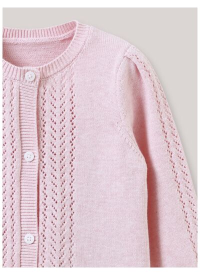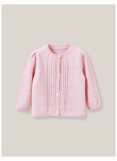 Confectionné avec soin, ce cardigan ajouré allie finesse et respirabilité grâce à son tricot aérien. Sa coupe ajustée et ses détails subtils apportent une touche de raffinement à toutes les tenues de votre bébé, du quotidien aux occasions spéciales. Facile à enfiler, il accompagne parfaitement les variations de température tout au long de la journée.