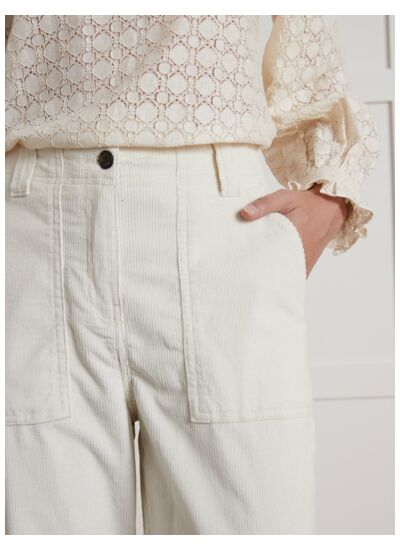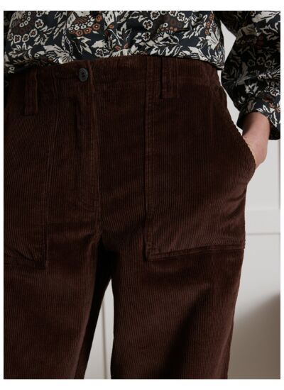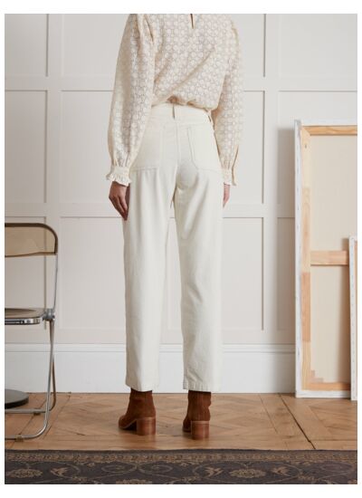 Fabriqué en velours 100% coton, il présente une taille mi-haute avec passants pour ceinture, fermeture zippée et bouton. Disponible en plusieurs coloris, il se lave facilement en machine tout en conservant sa tenue et sa douceur.