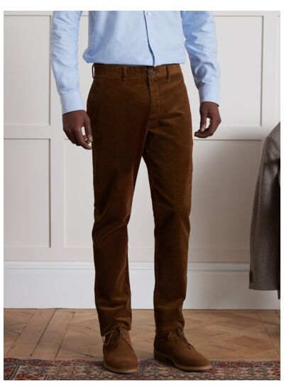 Pantalon en velours côtelé 100% coton. Coupe droite classique. Fermeture zippée avec bouton. Deux poches italiennes devant, deux poches passepoilées arrière. Entretien facile en machine.