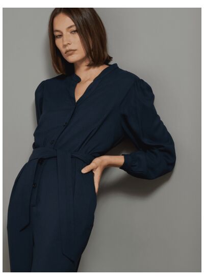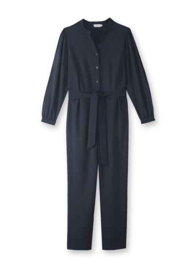 Fabriquée en crêpe léger, cette combinaison présente une coupe pantalon droite, un col en V discret et des manches longues. Elle se ferme par un zip invisible dans le dos pour un maintien parfait. Disponible dans une palette de couleurs sobres, elle s’adapte à toutes les occasions.