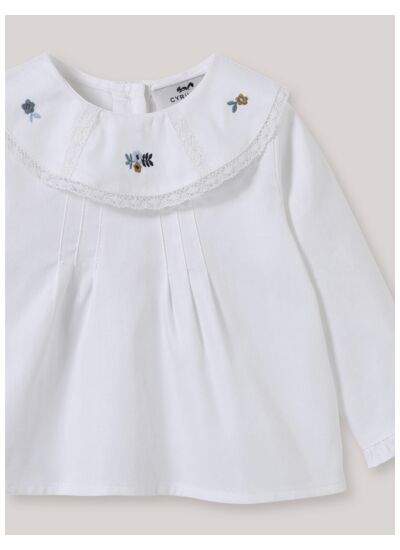 100% coton, broderie anglaise sur le col et les manches, boutons pression au dos, lavage en machine à 30 degrés recommandé.
