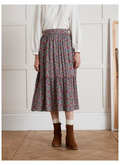 Fabriquée en tissu imprimé Liberty, cette jupe présente une taille élastiquée pour un ajustement parfait et un volant délicat qui structure la forme. Sa longueur midi flatteuse et sa composition légère garantissent un porté agréable en toute saison.