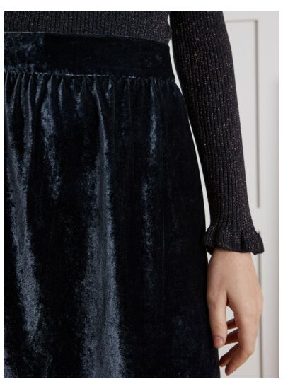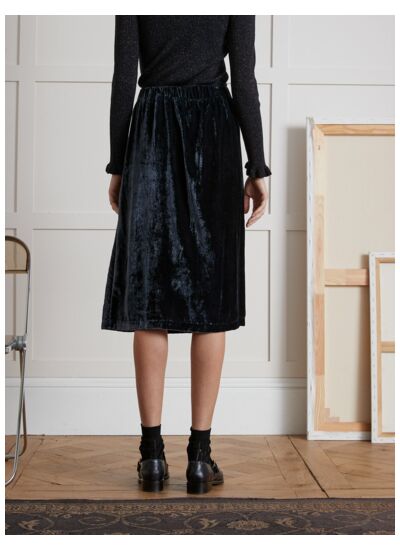 La jupe est réalisée en panne velour, un tissu à la fois doux et légèrement brillant, avec une coupe droite et une longueur midi. Elle est proposée dans une gamme de tailles adaptées à la morphologie féminine, sans détails superflus pour un style épuré.