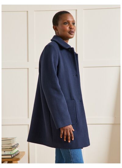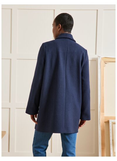 Manteau en tissu épais, coupe droite, col à boutons apparents, fermeture boutonnée sur le devant, manches longues, longueur mi-cuisse. Disponible en plusieurs tailles pour un ajustement parfait.