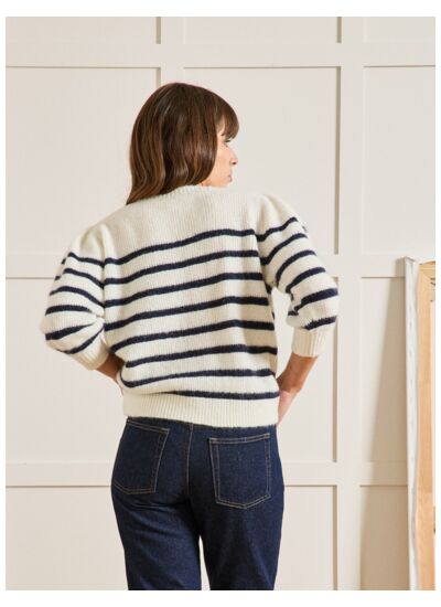 Confectionné dans un mélange mohair d’exception, il offre une texture légère et chaleureuse, idéale pour les températures fraîches. Sa coupe légèrement ajustée et son col marin iconique apportent une silhouette féminine et intemporelle, facile à associer à un jean ou une jupe. La finesse du tricot garantit une tenue impeccable et un toucher délicat sur la peau.