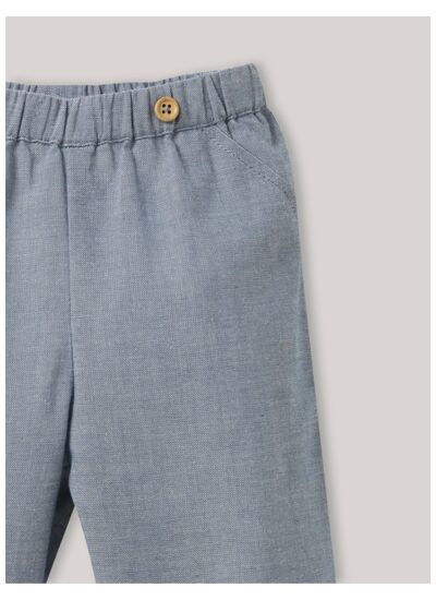 Fabriqué en chambray 100% coton, ce pantalon est léger et résistant. Entretien simple en machine, il conserve sa forme et sa couleur lavage après lavage. Disponible dans les tailles adaptées aux bébés, il respecte les normes de sécurité et de qualité Cyrillus.