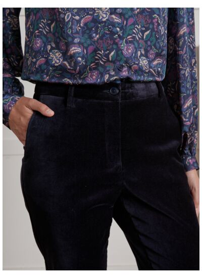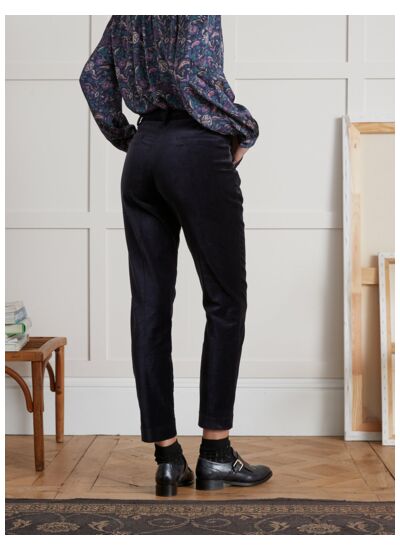 Ce pantalon est doté d’une taille mi-haute, de poches latérales pratiques et d’une fermeture zippée invisible sur le côté. Le tissu velours lisse est composé majoritairement de coton, garantissant douceur et durabilité.