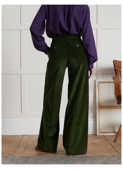 Pantalon large en velours 100% coton, taille haute avec ceinture intégrée, fermeture zippée latérale, poches latérales discrètes. Entretien facile, lavable en machine à 30 degrés.