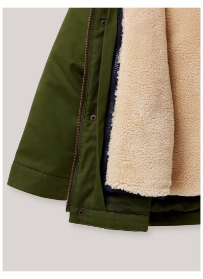 La parka est composée d’une coque extérieure en tissu déperlant, d’une doublure intérieure matelassée amovible avec fermeture zippée, col montant et capuche ajustable. Elle dispose de poches sécurisées, d’une fermeture zippée avec rabat et de finitions renforcées aux poignets et à l’ourlet pour une meilleure isolation.