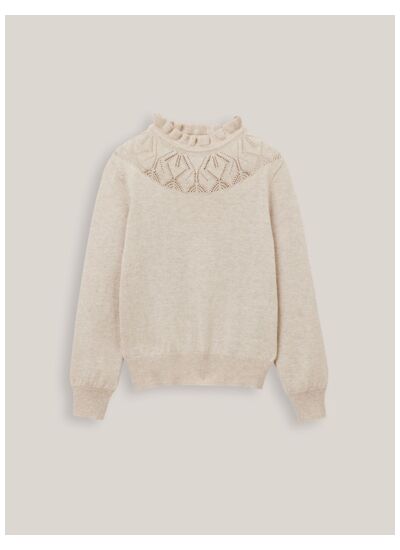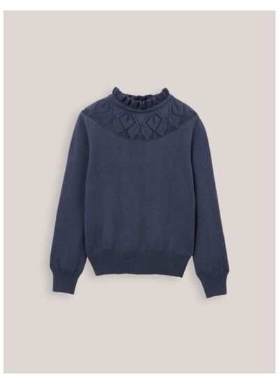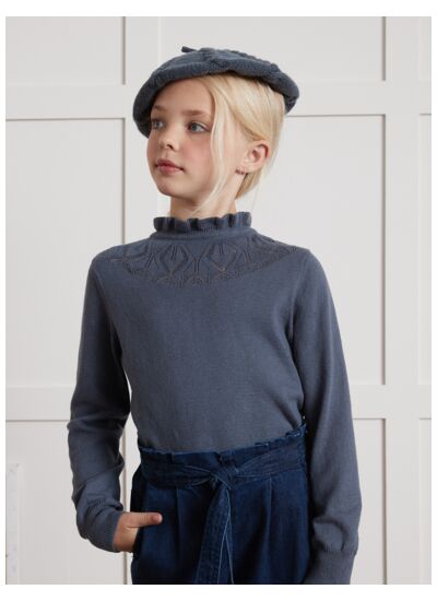 Fabriqué par Cyrillus, ce pull à volant est disponible en taille fille et conçu pour la saison 24H. La maille fine assure légèreté et chaleur modérée, tandis que les volants apportent un détail mode subtil et moderne.