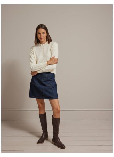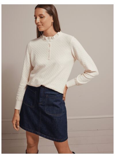 Confectionné dans des matières soigneusement sélectionnées, ce pull revisite le classique de la blouse avec une touche contemporaine. Son col chemise structuré et ses finitions nettes apportent une allure sophistiquée, idéale pour passer du bureau à une sortie en ville sans compromis sur le style. Léger et facile à porter, il s’intègre parfaitement à toutes vos tenues.