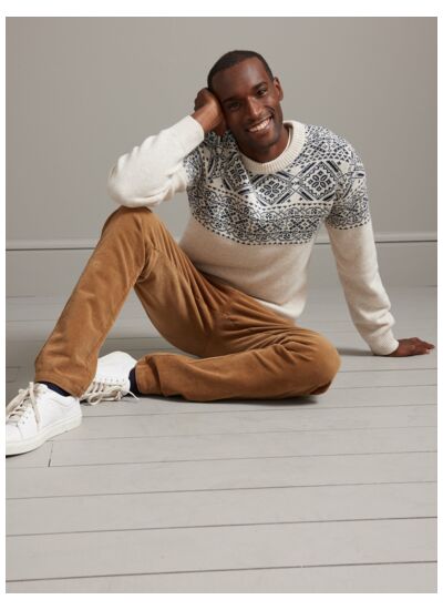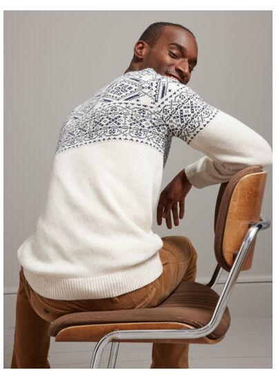 Fabriqué en maille jacquard, ce pull présente une coupe droite avec col rond et finitions bord-côte aux poignets et à la base. Disponible dans la collection Homme saison 23H, il est proposé par la marque Cyrillus, reconnue pour son savoir-faire et la qualité de ses matières.