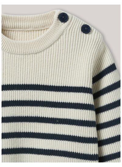 Confectionné dans une maille fine et résistante, ce pull offre une silhouette classique rehaussée par les rayures marines emblématiques. Sa coupe ajustée garantit une liberté de mouvement idéale pour les tout-petits, tandis que la qualité des matériaux assure une tenue durable lavage après lavage. Parfait pour les journées fraîches, il s’associe facilement à un pantalon ou une salopette pour un look intemporel.